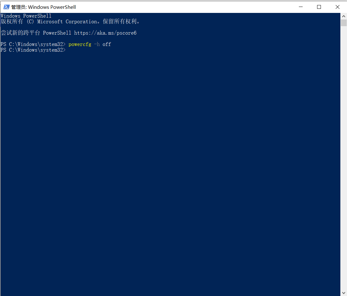 我们使用Windows PowerShell,输入以下命令就可以即可关闭休眠功能,同时hiberfil.sys文件也会自动删除。